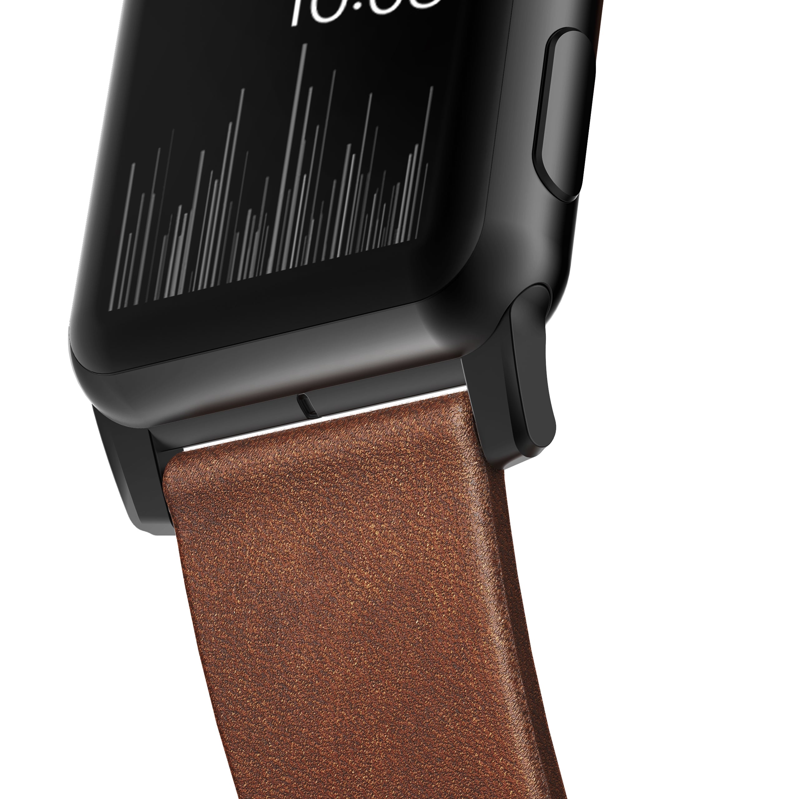 Nomad Modern leather band brown / black hardware 45/49 mm is designed to give your Apple Watch a classic, yet bold new look. Made from minimally treated, vegetable tanned leather from one of America's oldest tanneries. The leather is designed to beautifully patina with time, creating a handsome, rich leather band with a look that is uniquely yours.