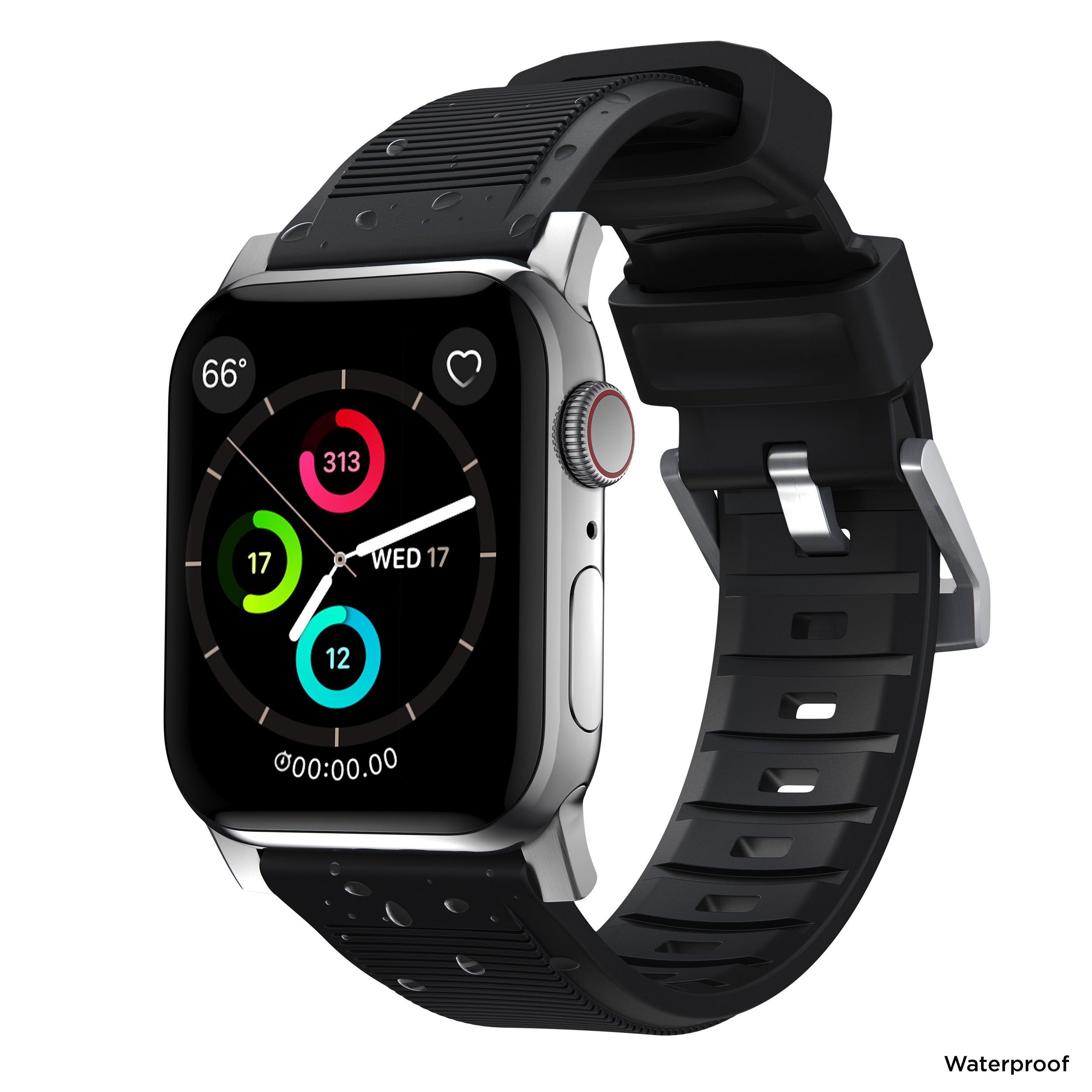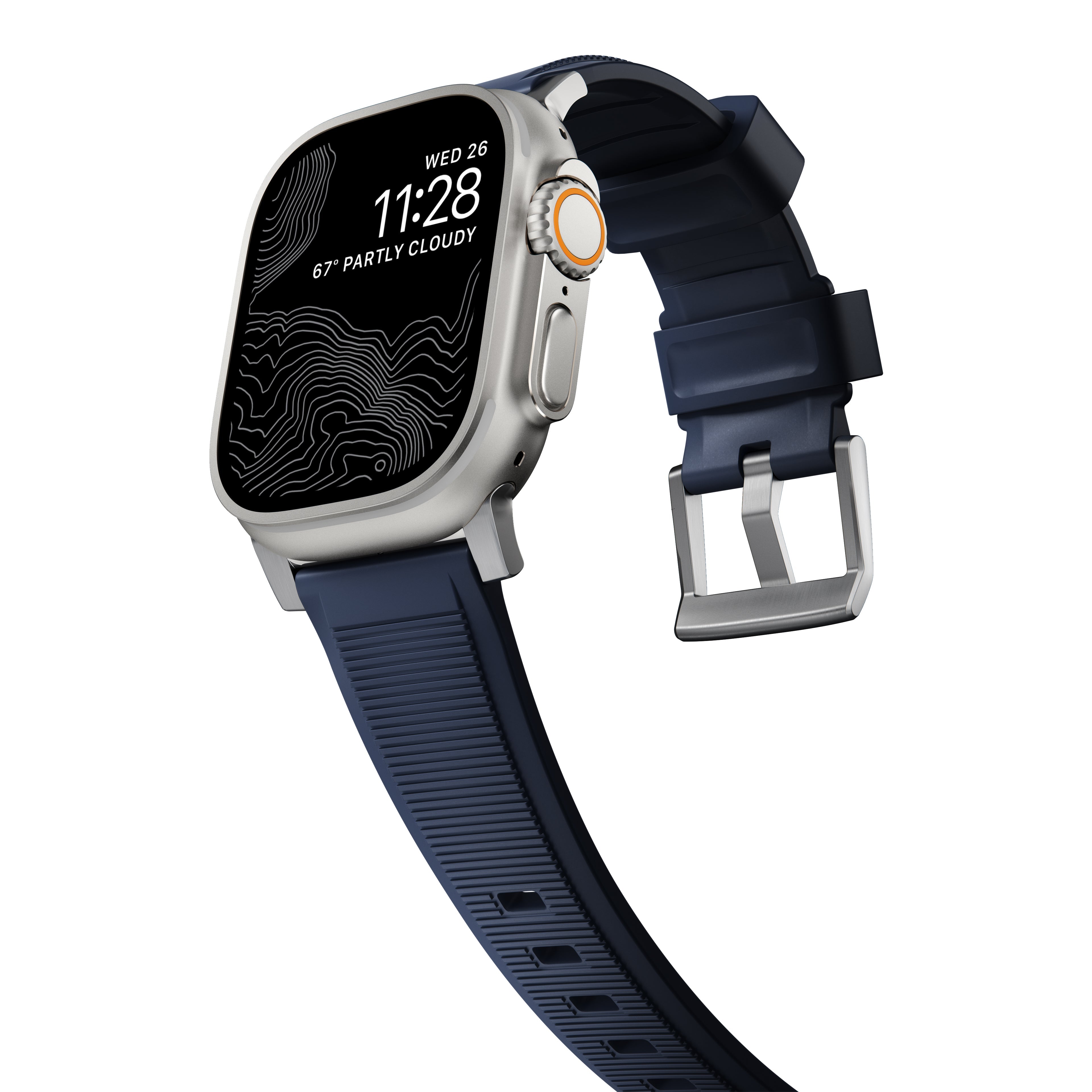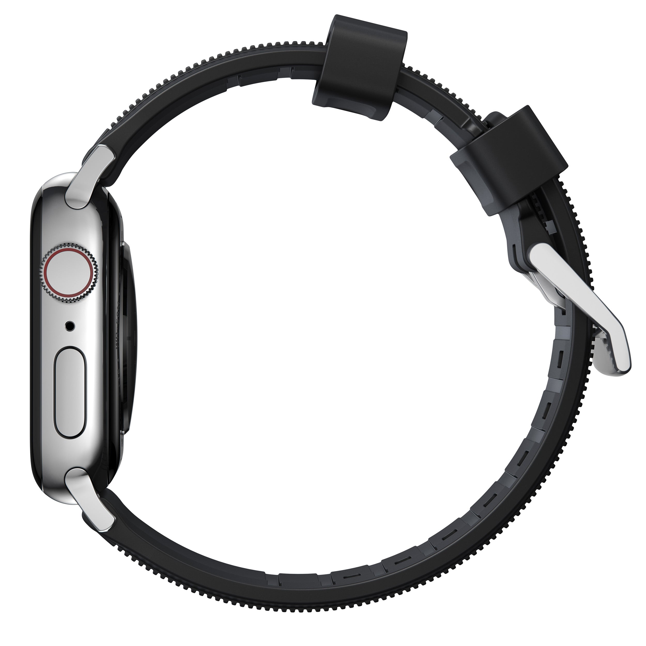 Nomad Rugged band / silver hardware 45/49 mm is designed to give your Apple Watch a modern, rugged look for daily wear or on your next adventure. Rugged Band is constructed from FKM, a soft yet strong fluoroelastomer that combines all-day comfort with lasting durability. Custom-designed, injection-molded stainless steel hardware provides a secure fit and unique style.